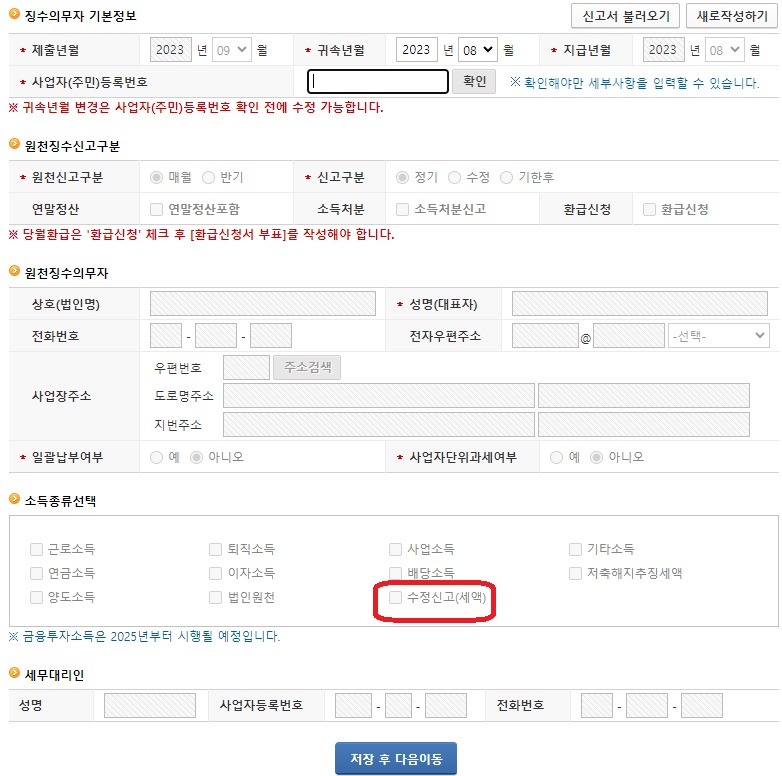 - ★이번달★ 원천세 신고서에서 소득종류를 체크할 때 '수정신고(세액)'도 함께 체크합니다.