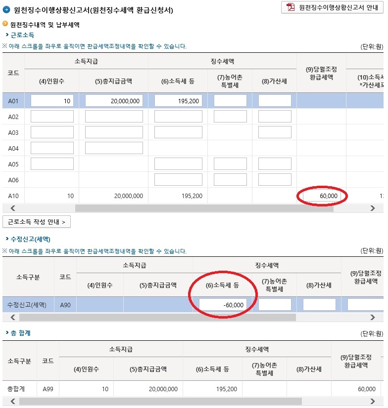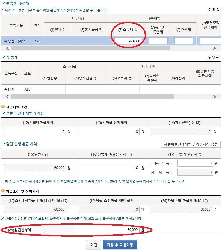 * 환급의 경우에는 수정신고(세액) 소득세에 마이너스(-) 금액을 써주면 돼요.