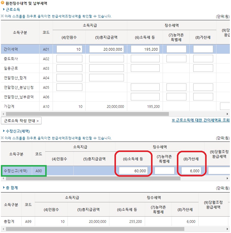 - 여기에 수정신고로 증가된 소득세와 가산세를 입력해줍니다.