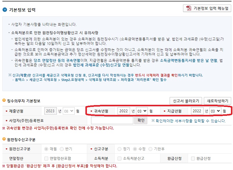 ② 귀속년월, 지급년월을 당초 원천세 신고서랑 동일하게 입력